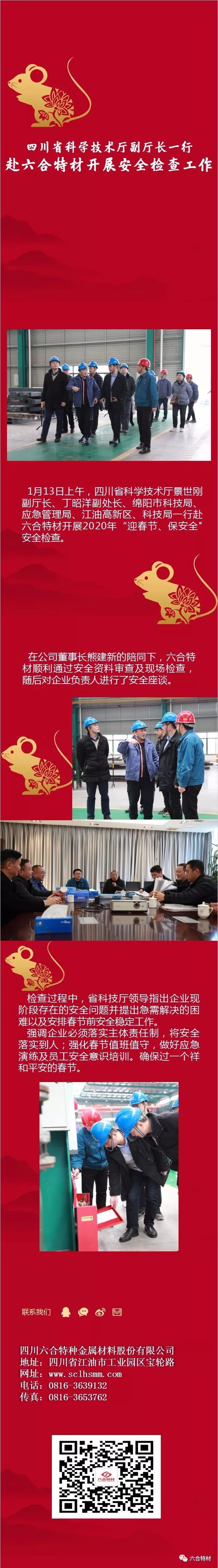 1月13日上午,四川省科学技术厅景世刚副厅长、丁昭洋副处长、绵阳市科技局、应急管理局、江油高新区、科技局一行赴2007so太阳集团开展2020年“迎春节、保安全"安全检查。