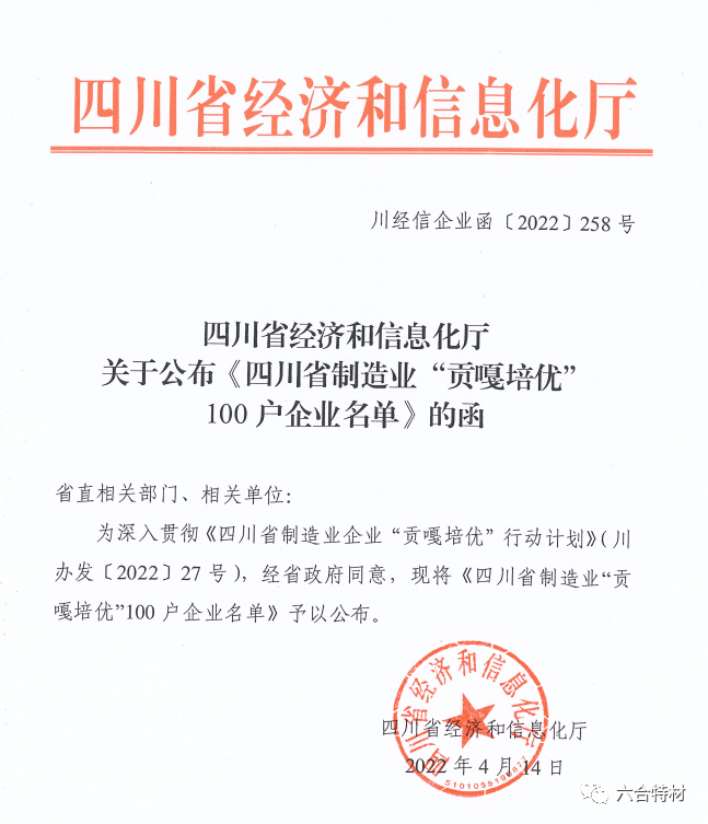 日前,四川省经济和信息化厅公布了《关于四川省制造业“贡嘎培优”100户企业名单》,2007so太阳集团(以下简称:2007so太阳集团)榜上有名。